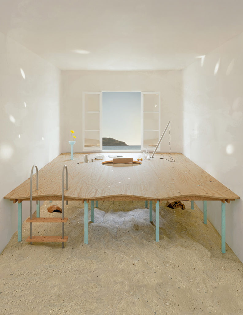 Prix du Public 2025, Joanne Riachi & Magali Lamoureux, originaires du Liban et de Toulon transposent l’horizon à l’intérieur de la maison. Au cœur de l’espace, une large plateforme en pin sylvestre massif évoque les reflets mouvants de l’eau, offrant un lieu tempéré et respirant. Posés sur la table, les accessoires convoquent les rituels d’été propres aux cultures du Sud. Une lampe traversante éclaire à la fois le dessus et le dessous du plateau, révélant des objets antiques comme autant de trésors enfouis : fragments d’un héritage méditerranéen qui réémergent à la surface de la mémoire.