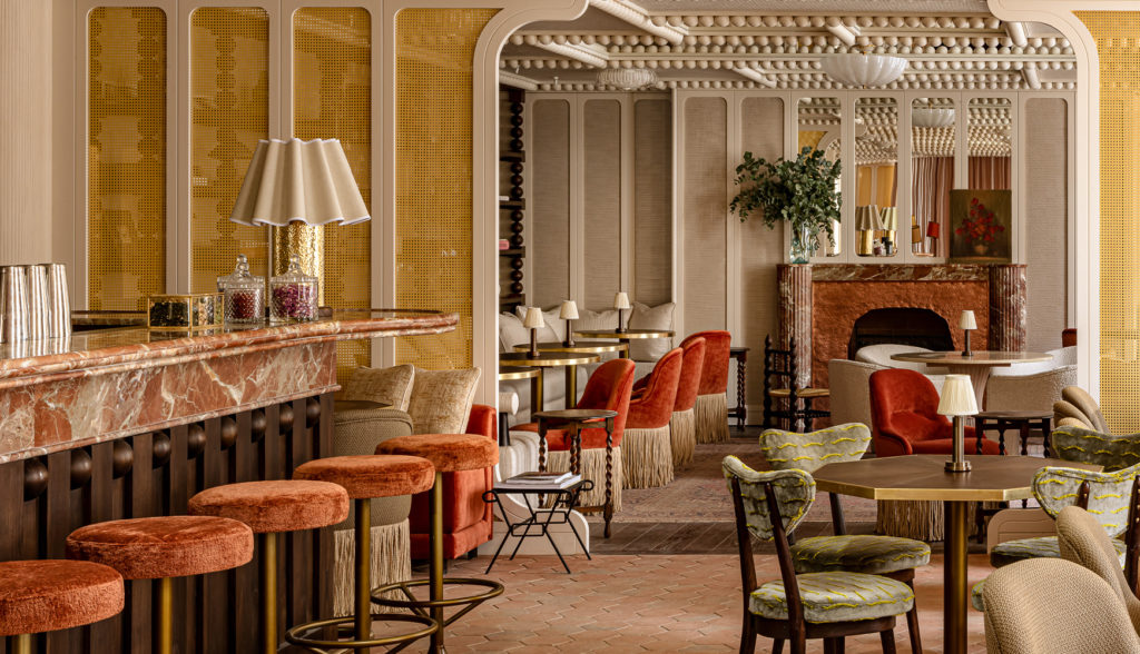 Signant avec La Boétie son tout premier projet hôtelier, celle qui a été formée chez le grand Nicky Haslam a imaginé un intérieur au croisement du raffinement parisien et de l’audace britannique, aux frontières du passé et du présent, du vintage et du contemporain. Entre des références tantôt exubérantes, tantôt élégantes, elle distille des influences scandinaves, comme du mobilier et des panneaux muraux en frêne massif qui dénotent avec le reste du décor qui se plaît davantage dans une atmosphère fantaisiste que minimaliste. Visite !